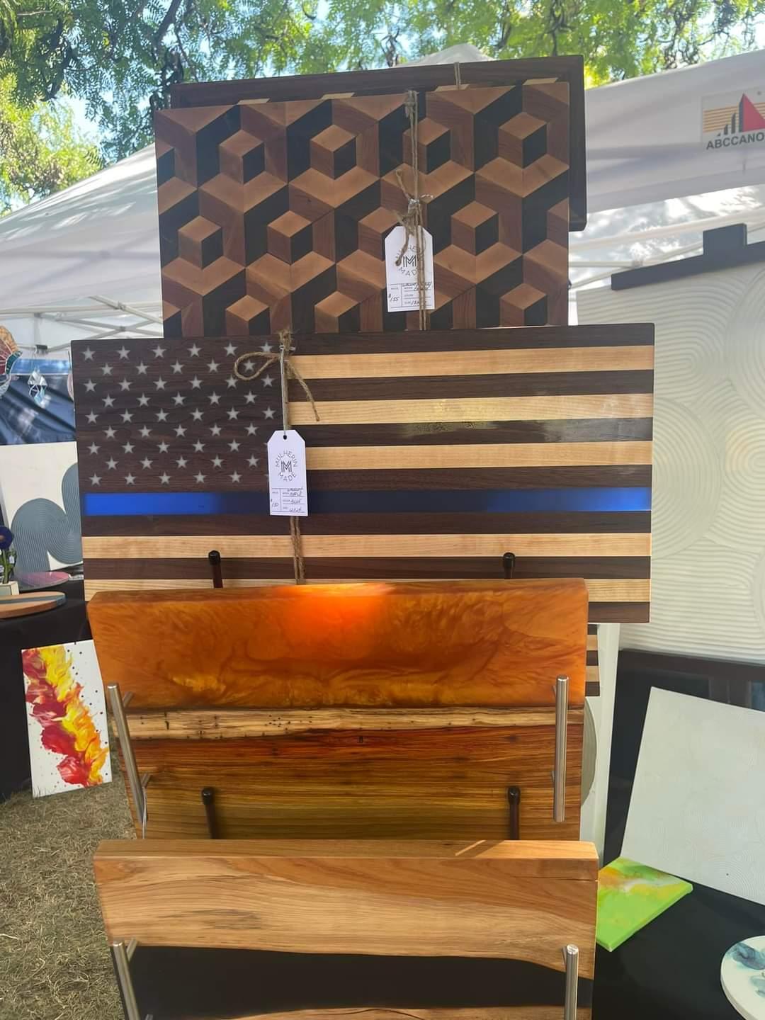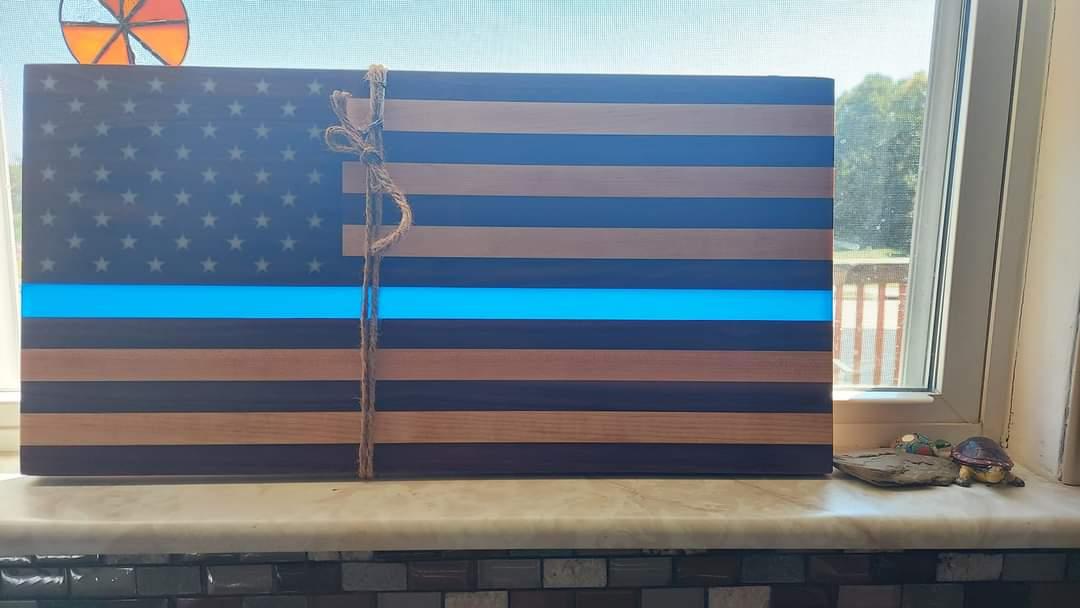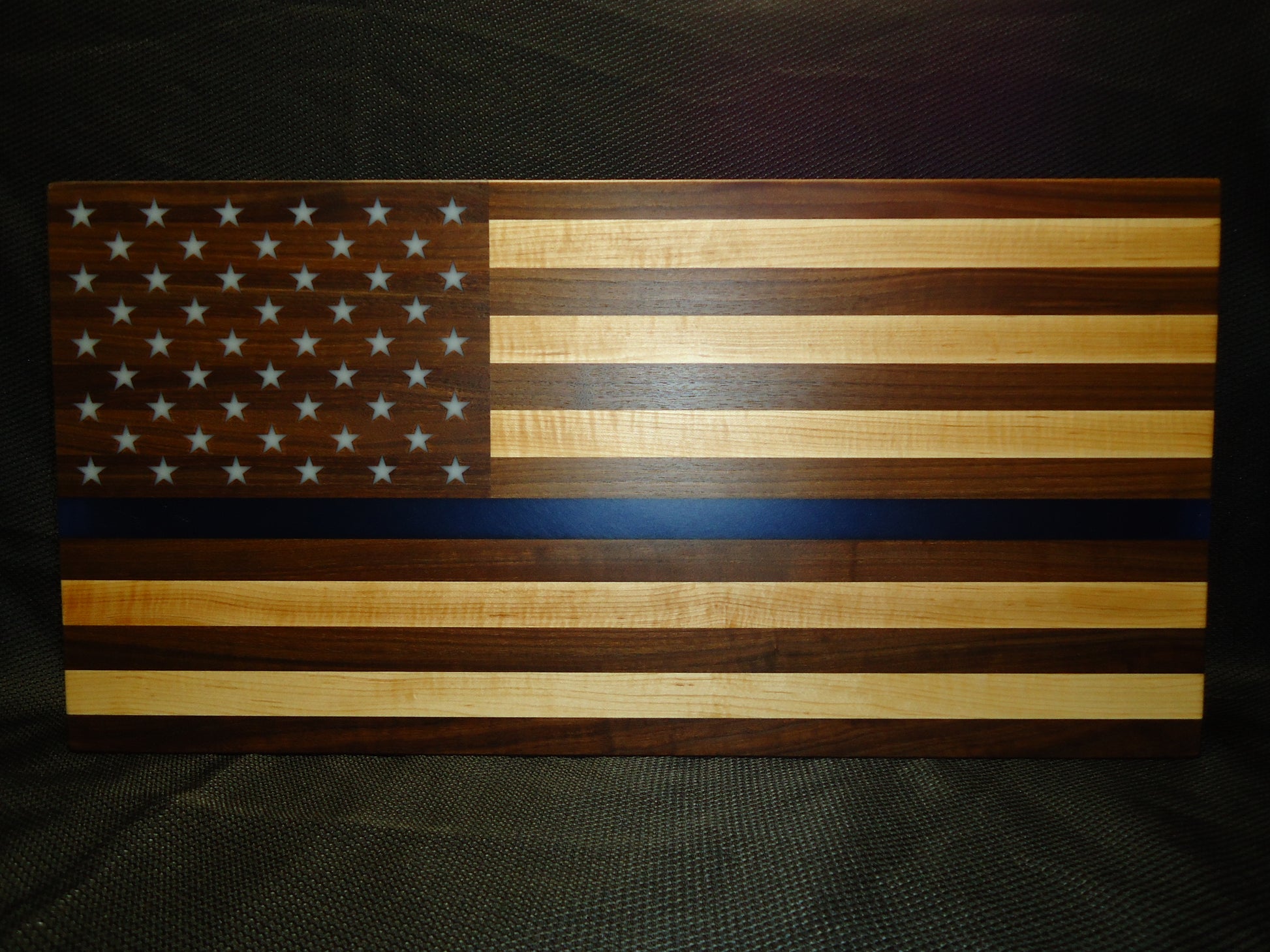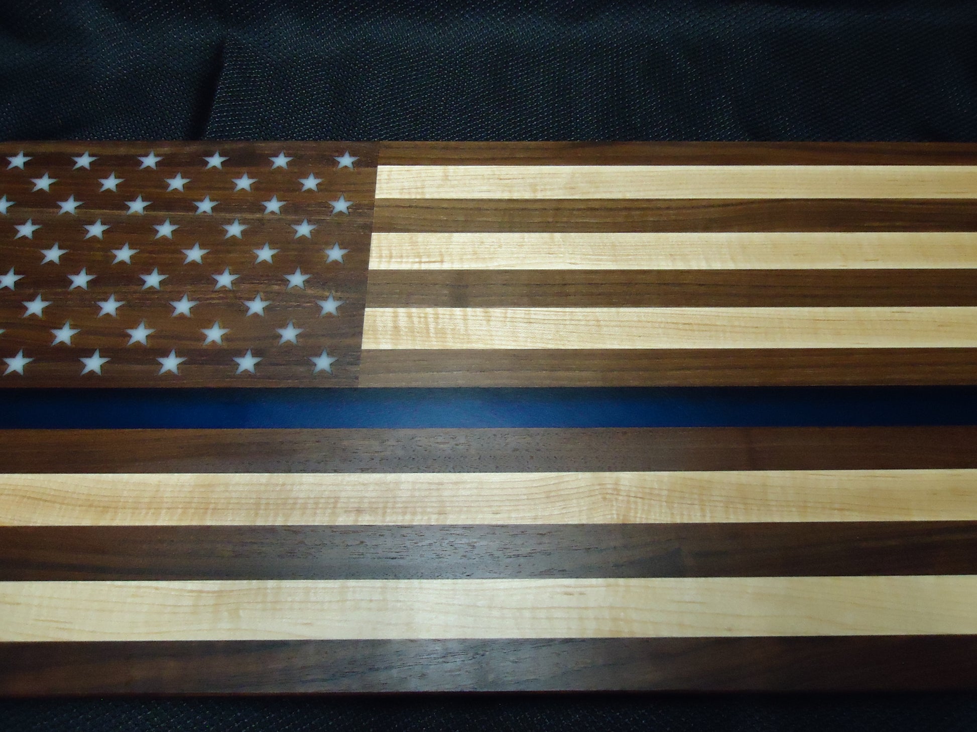 American Flag Constructed of Walnut and Maple Wood With a Blue Translucent Resin Stripe Honoring Law Enforcement